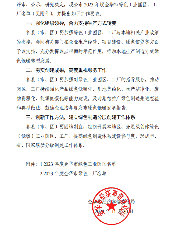 近日,為更好助力金華市工業(yè)領(lǐng)域“雙碳”工作,開展美麗金華建設(shè)、“無廢城市”創(chuàng)建等工作。金華市經(jīng)濟(jì)和信息化局開展“2023 年度金華市綠色工業(yè)園區(qū)、工廠”申報(bào)工作。我司 “浙江杭機(jī)股份有限公司”獲評(píng)“2023 年度金華市綠色工廠”。